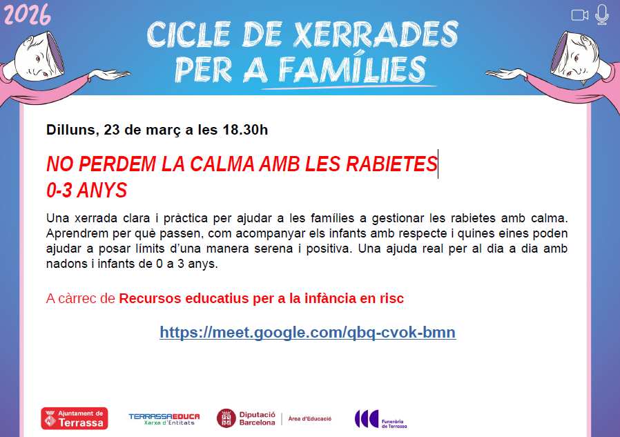 Quarta xerrada del Cicle de Xerrades Online per a les famílies per aquest any 2026, “No perdem la calma amb les rabietes. 0-3 anys”, pel dimecres 18 de març a les 18:30h de la tarda. Com a mesura per millorar l’accesibilitat, recordeu que a les xerrades meet es poden activar els subtítols en llengua catalana. “No […]