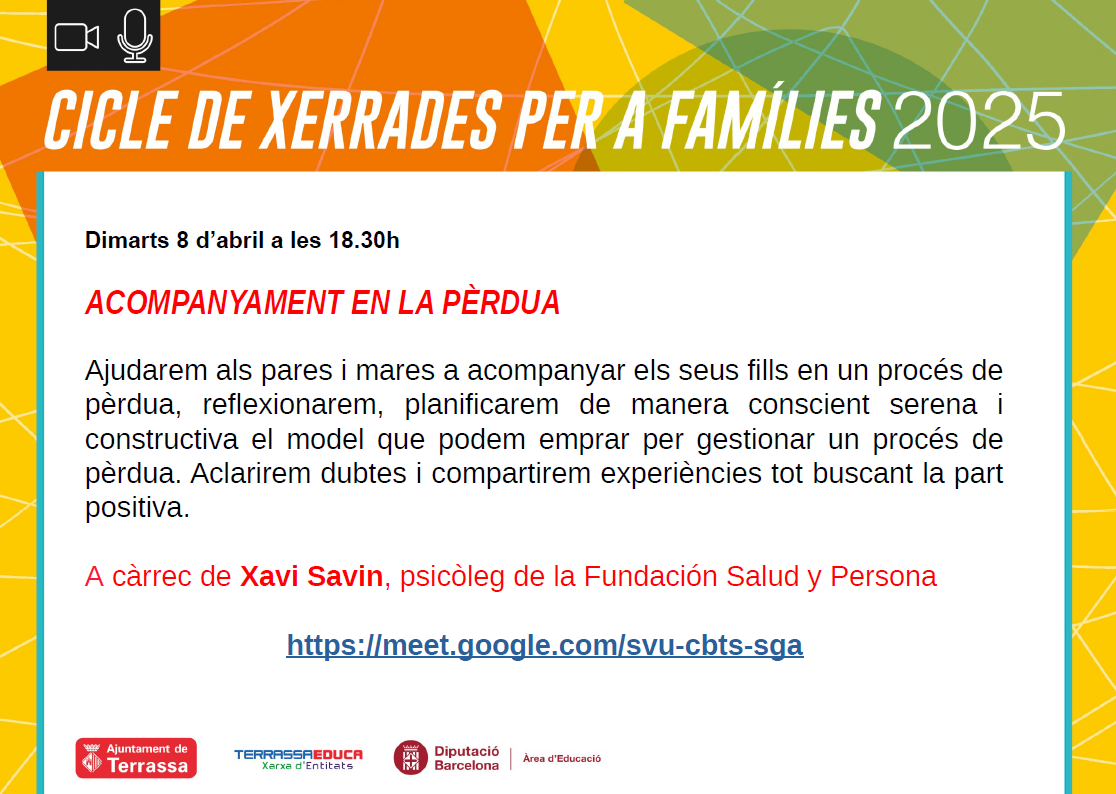 6a xerrada del Cicle de Xerrades Online per a les famílies per aquest any 2025. “Acompanyament en la pèrdua”. Serà online el dimarts dia 8 d’abril a les 18.30h.