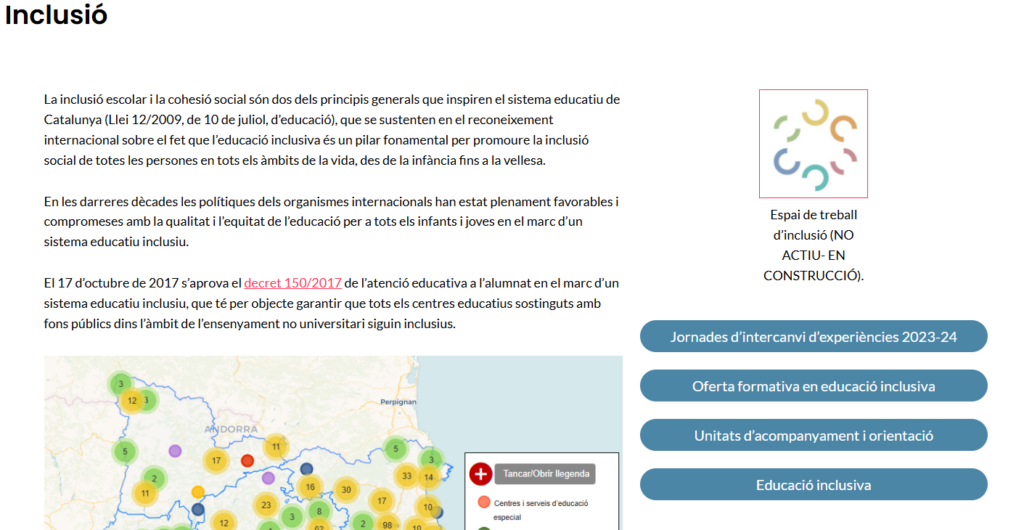 Compartim amb vosaltres espais web d’Educació Inclusiva de referència a nivell de Catalunya i de territori on podreu trobar recursos pel que fa a les Mesures i Suports, DUA; projectes; formació…