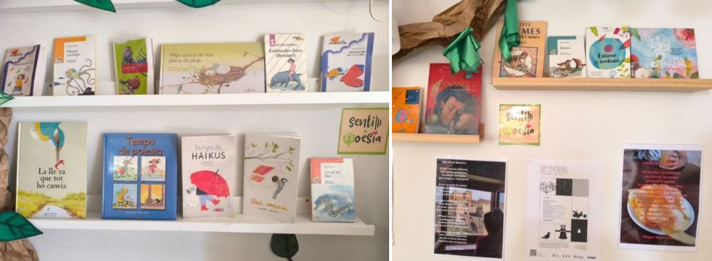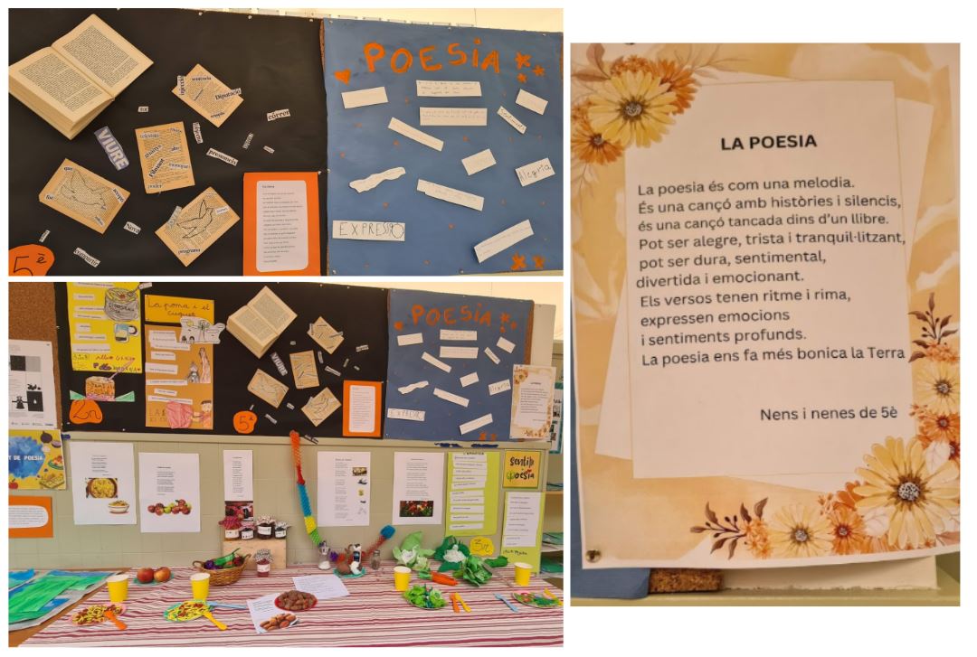 A l’escola Torre de la Llebre ja fa dies que vam iniciar el treball de la poesia a l’escola. Hem tret els llibres de poesia fora de la prestatgeria habitual i els hem posat als passadissos per tal de fer-la més visible. Cada comunitat ha treballat un tema i n’ha fet una part més visual i una altra de més literària. La comunitat de petits ha dedicat el llenguatge poètic als colors, la de mitjans al menjar i la de grans als llibres, els poetes i la poesia.
