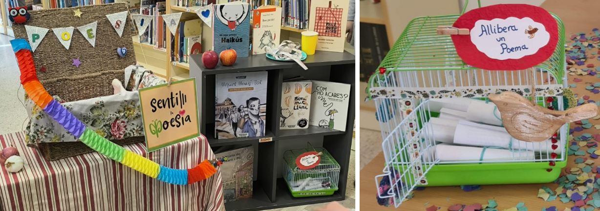 El dia 21 de març, dia mundial de la poesia es va omplir el passadís amb alguns treballs de les aules i es van penjar poemes a les parets, per tal d’omplir l’escola de poesia. Les activitats de les comunitats de mitjans i grans s’han fet des de les hores d’animació lectora de la biblioteca. Totes les sessions tenien el mateix ordre: lectura d’un poema, presentació de llibres de poesia, parlar del què era la poesia per ells i elles i què els feia sentir, lectura del poema que havien de treballar, presentar el poeta o poetessa i fer la tasca literària i plàstica. Acabàvem la sessió alliberant un poema d’una gàbia per portar-lo a l’aula.