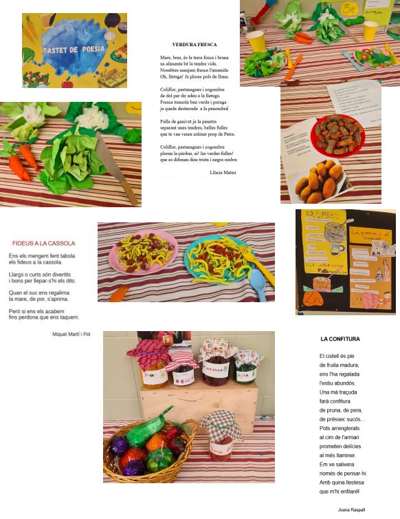 Amb la comunitat de mitjans hem parat taula i hem fet un «Tastet de poesia». Cada grup-classe ha treballat dos poemes de menjars de diversos poetes i poetesses i n’han fet una representació plàstica i també una nova versió del poema treballat.
