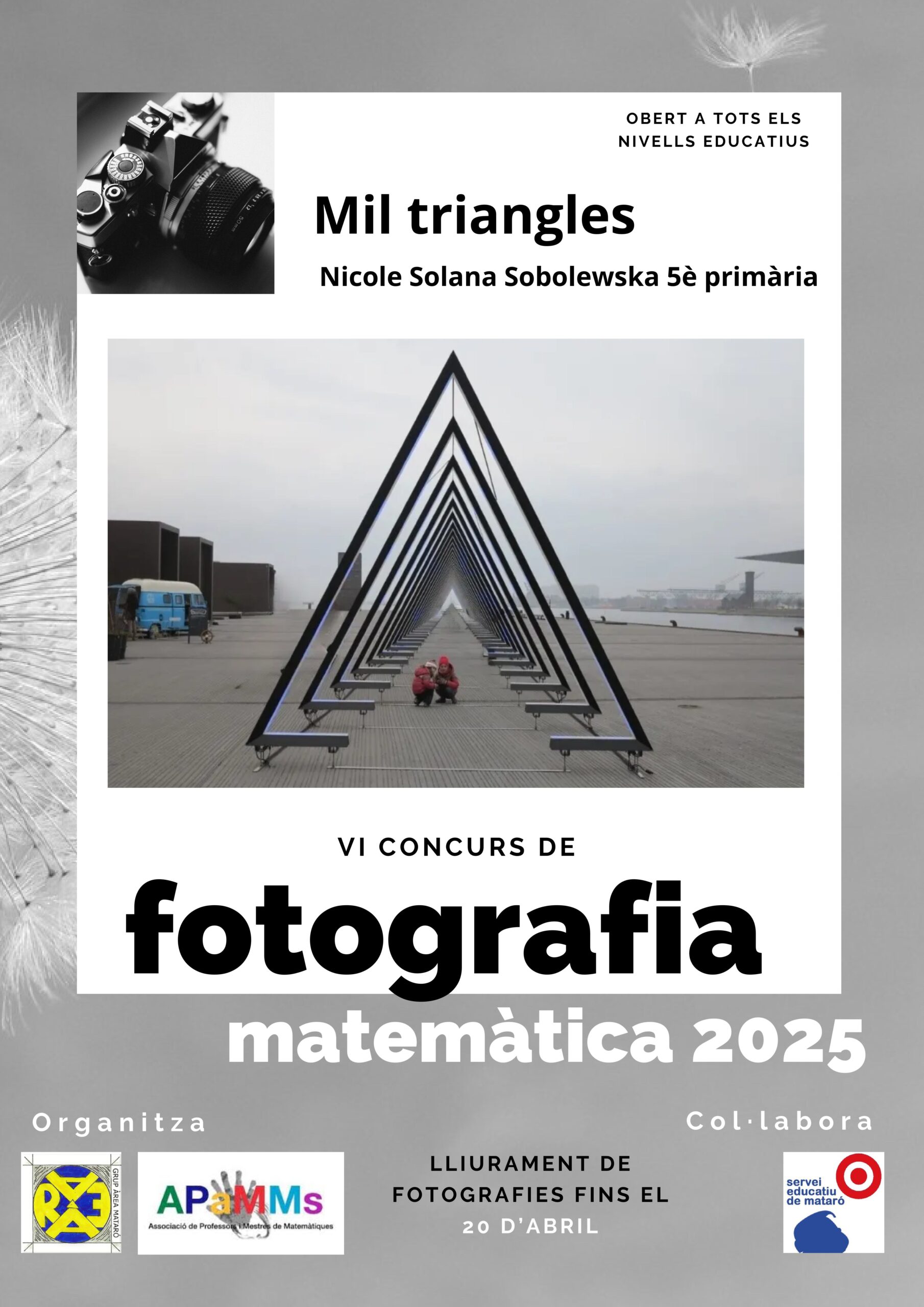 El Grup Àrea us convida a participar al VI CONCURS DE FOTOGRAFIA MATEMÀTICA, amb l’objectiu d’obrir els ulls a totes aquelles petites situacions que observem o accions que fem diàriament de forma inconscient i en les que s’amaguen infinitat de conceptes matemàtics. Mireu al vostre voltant des d’una càmera i segur que iniciareu una relació intensa i sorprenent amb el món de les matemàtiques.