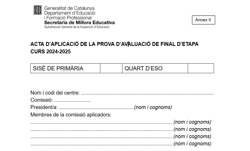 Acta proves 6è de primària 2025 Feu un comentari / Per admin / 17/03/2025 / Proves de 6è de Primària Teniu la plantilla de l’acta en versió document de Google o amb PDF.