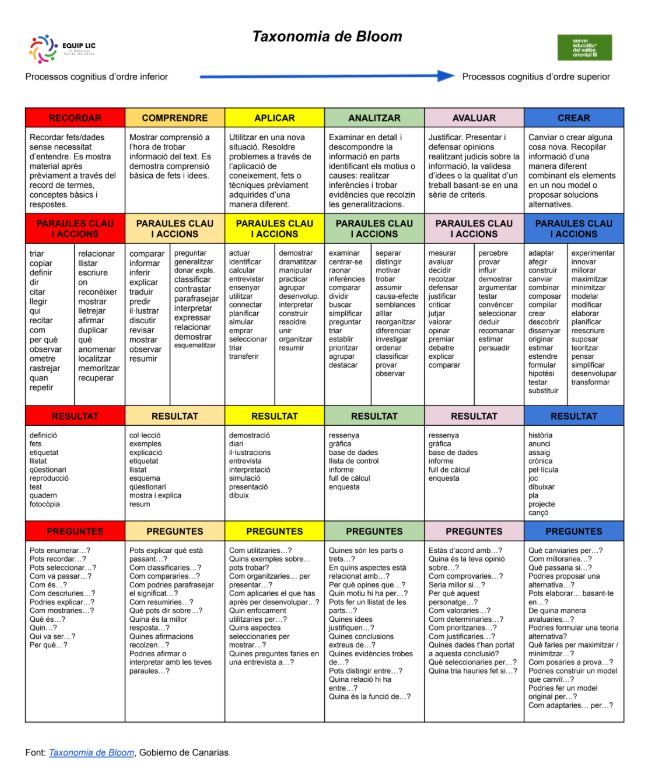 Taxonomia de Bloom (en català): processos cognitius, paraules clau i preguntes per dissenyar objectius, criteris i indicadors d’avaluació.