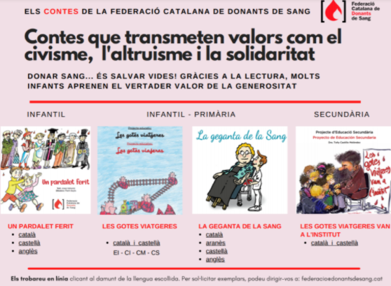 La Federació Catalana de Donants de Sang comparteix quatre contes pensats per treballar els valors com l’altruisme, el civisme, la solidaritat… Aquests contes són un bon recurs per potenciar el creixement global de l’infant, ja que la formació en contextos reflexius, crítics i emocionals, genera respostes assertives i principis basats en el benestar envers un mateix i també envers els altres.