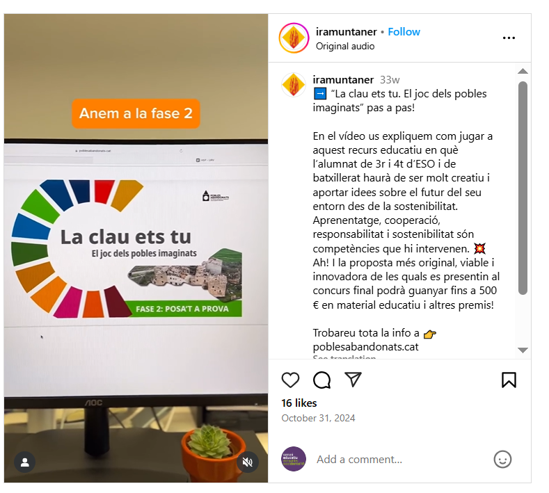 “La clau ets tu. El joc dels pobles imaginats” és un recurs educatiu en format joc que pretén treballar els Objectius de Desenvolupament Sostenible des del problema de l’abandonament i els desequilibris territorials.