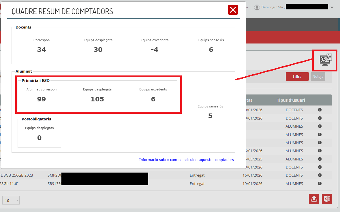 S’ha obert el procés que permet als centres educatius demanar equips per 5è i 6è de primària. El procediment estarà obert fins al 15 de maig de 2026. Per poder demanar equips, el nombre d’alumnes matriculats ha de ser superior al nombre d’ordinadors desplegats. Per comprovar si el centre té excedent d’equips, cal anar a INDIC → Inventari → Equipaments, fer clic a la icona de l’ordinador i comprovar el camp Equips excedents al quadre resum. Per poder demanar ordinadors, el valor ha de ser negatiu.