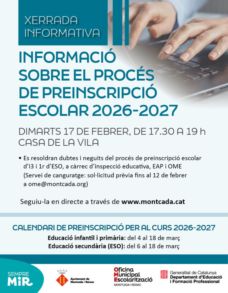 Tal com ja fa diversos cursos que fem, des de l’OME conjuntament amb inspecció educativa i l’EAP, organitzem una xerrada informativa on es resoldran dubtes i neguits sobre la preinscripció escolar d’I3 i 1r d’ESO, amb l’objectiu d’acompanyar a les famílies en el procés.
