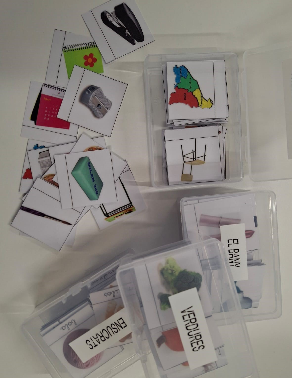 Temàtiques: material escolar, colors, fruites, verdures, bany, aliments preparats, Nadal, ensucrats.