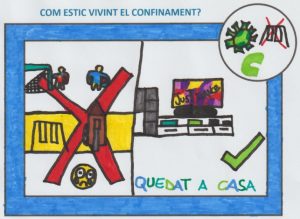 Sobre les imatges, hi havia alumnes que elaboraven dibuixos amb un alt contingut metafòric com, per exemple, una alumna que va dibuixar un castell com a fortificació que simbolitzava casa seva, un lloc segur, i altres que representaven més literalment la seva situació com, per exemple, una alumna que va dibuixar-se a ella mateixa mirant per la finestra i el que veu a través d’ella. Alguns també van dibuixar situacions de contrast, moments d’alegria i tristesa, positiu i negatiu, yin i yang,… Una alumna va dibuixar una científica que connectava amb un dels projectes que estàvem fent per simbolitzar l’esperança en la recerca d’una vacuna.