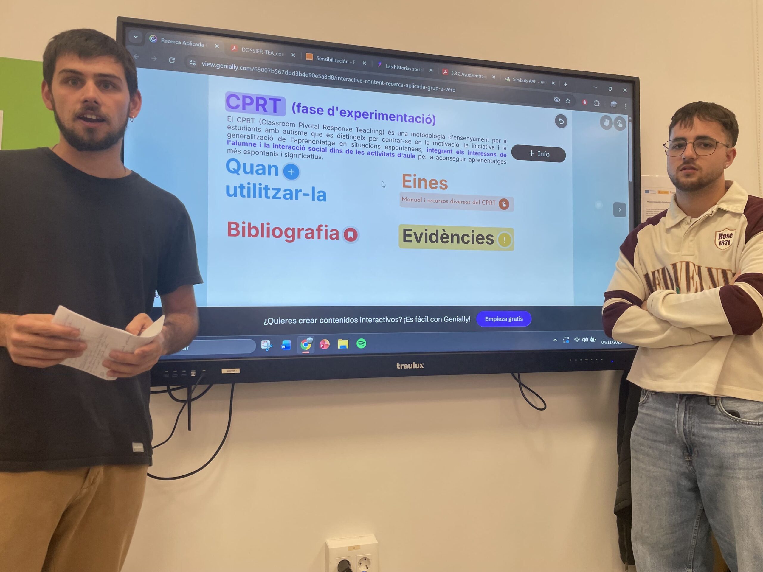 Els tècnics del CRP van participar, el passat dimarts 4 de novembre, en la presentació dels treballs de l’alumnat de 3r curs del Grau de Magisteri de la UAB, dins l’assignatura de Psicologia de l’Educació impartida per Andy Morodo. Durant la sessió, els futurs mestres van exposar propostes per millorar aspectes fonamentals dels centres educatius, com ara l’avaluació formativa, el lideratge pedagògic dels equips directius, l’atenció a l’alumnat amb necessitats educatives i l’enfocament de l’escola inclusiva.