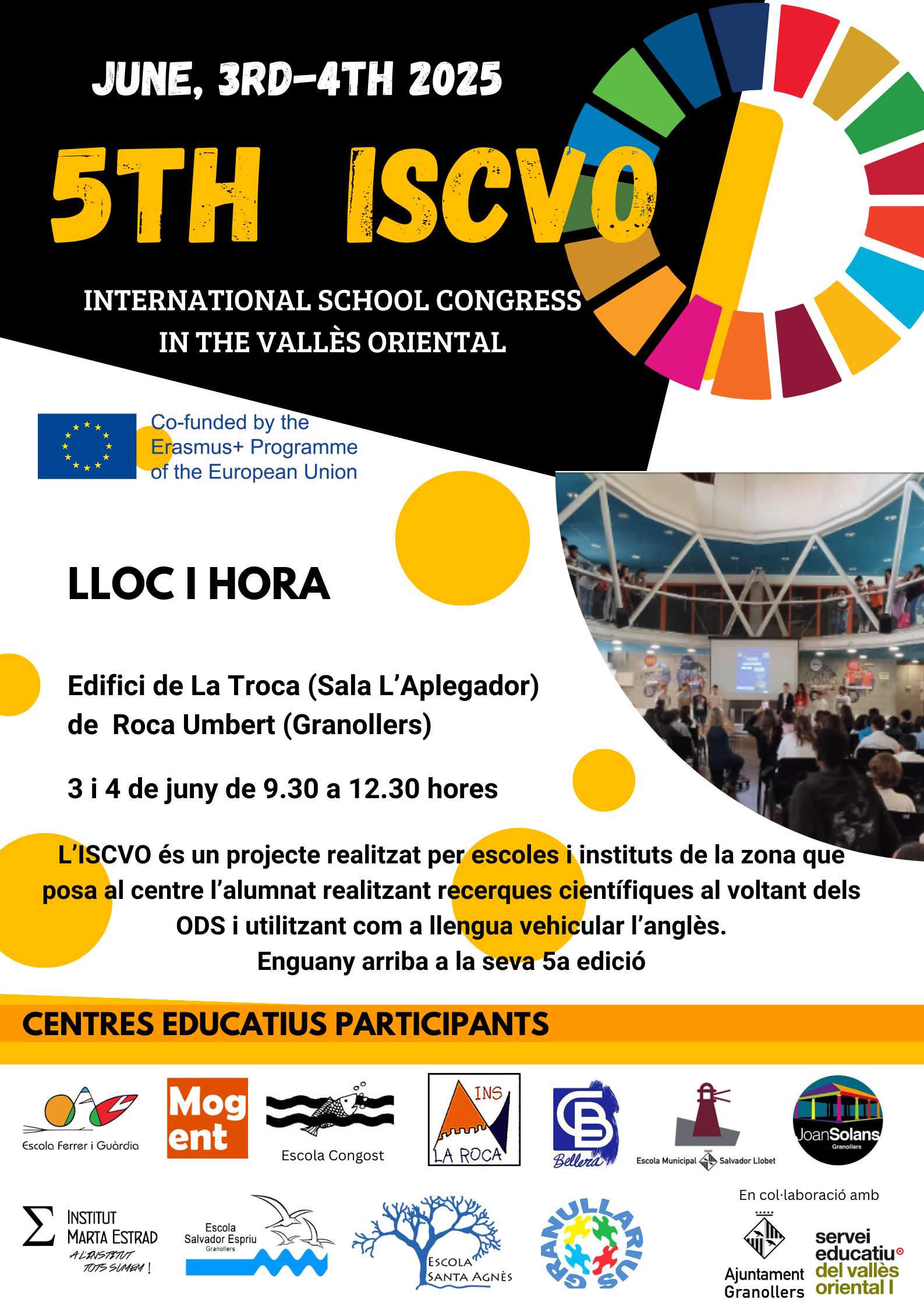 Els dies 3 i 4 de juny s’ha celebrat la 5a edició de l’ISCVO (International School Congress in the Vallès Oriental) a l’edifici de La Troca de Roca Umbert (Granollers). L’ISCVO és un projecte realitzat per escoles i instituts de la zona que posa al centre l’alumnat realitzant recerques científiques al voltant dels ODS i utilitzant com a llengua vehicular l’anglès. És un projecte coordinat des del CRP VOI en el marc del projecte Erasmus+.
