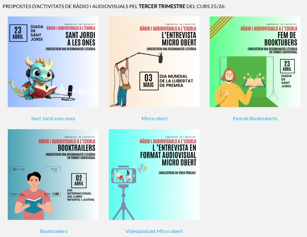 Consulteu l’apartat projectes>Ràdio a l’escola. Podeu escollir aquelles que millor s’adaptin al vostre alumnat.