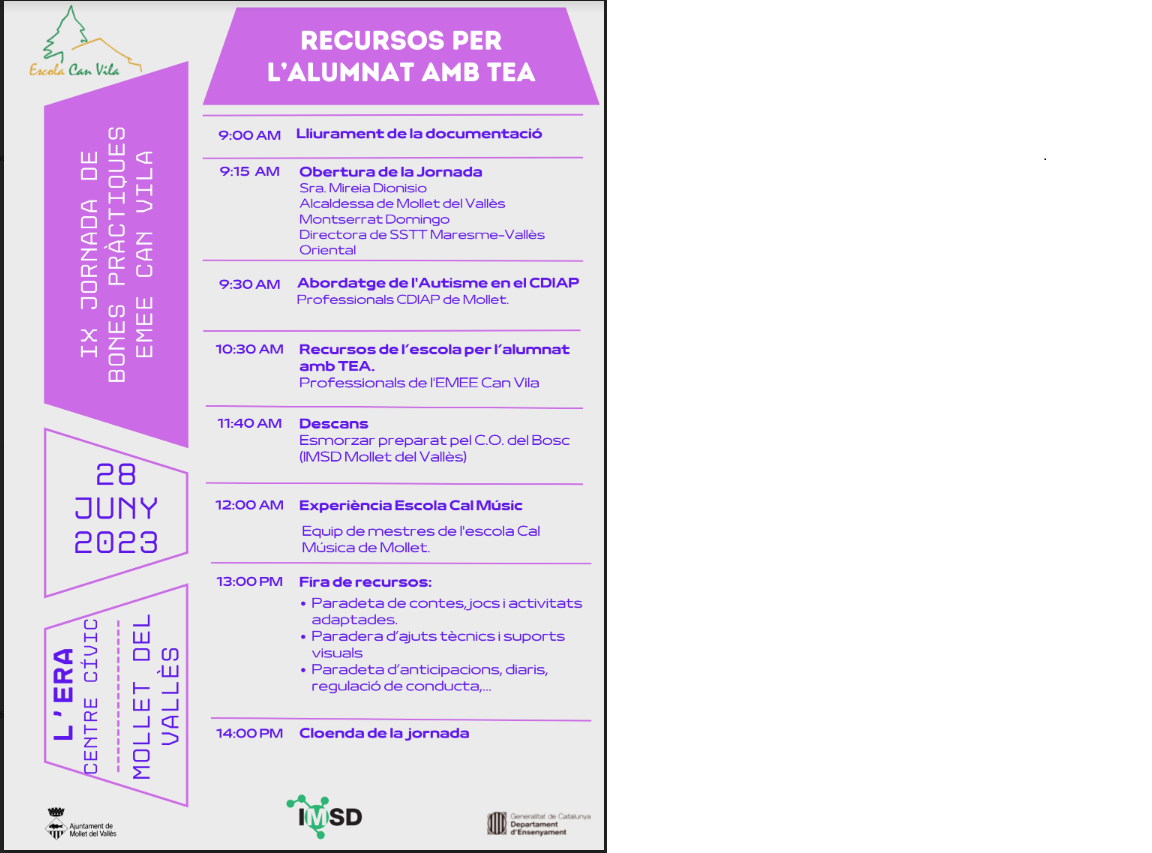 Aquestes jornades giren al voltant del tema de l’abordatge de l’alumnat TEA a les estratègies pedagògiques a l’aula. Comptarem amb la participació del CDIAP, de l’escola Cal Músic de Mollet, i de les pròpies experiències del centre amfitrió Can Vila de Mollet.