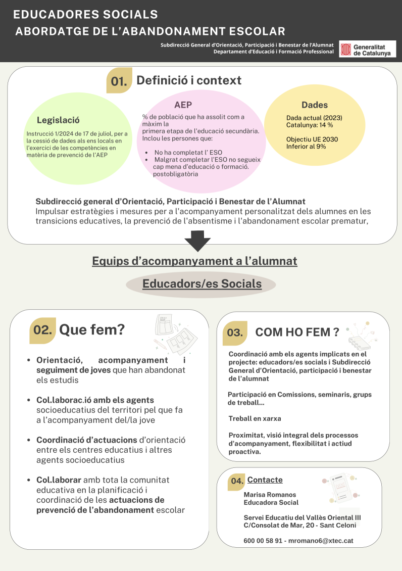 El Servei Educatiu del Vallès Oriental III compta amb la figura de l’educadora social, incorporada en el marc del Pla de xoc contra l’abandonament escolar prematur impulsat pel Departament d’Educació i Formació Professional