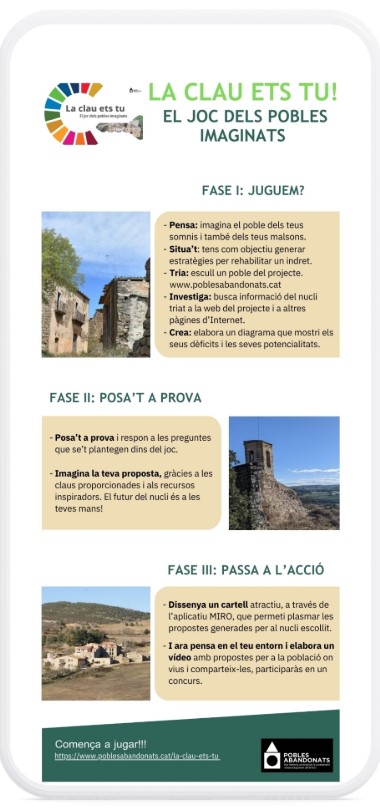 La clau ets tu. El joc dels pobles imaginats” és un recurs educatiu en format joc que pretén treballar els Objectius de Desenvolupament Sostenible des del problema de l’abandonament i els desequilibris territorials.