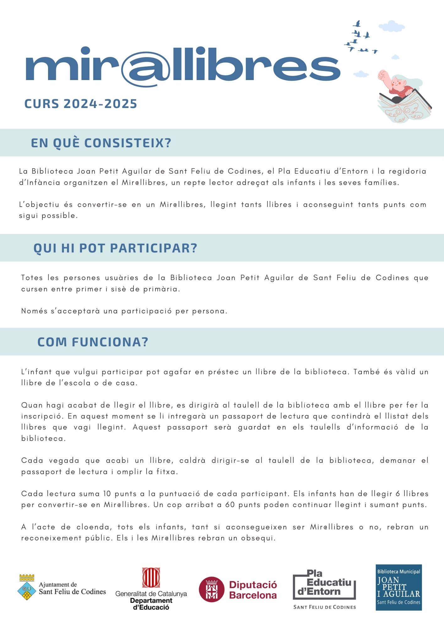 Si tens entre 6 i 12 anys, participa en aquest repte i endinsa’t en la màgia dels llibres! Objectiu? Convertir-te en un Mir@llibres llegint tants llibres com puguis i sumant punts.