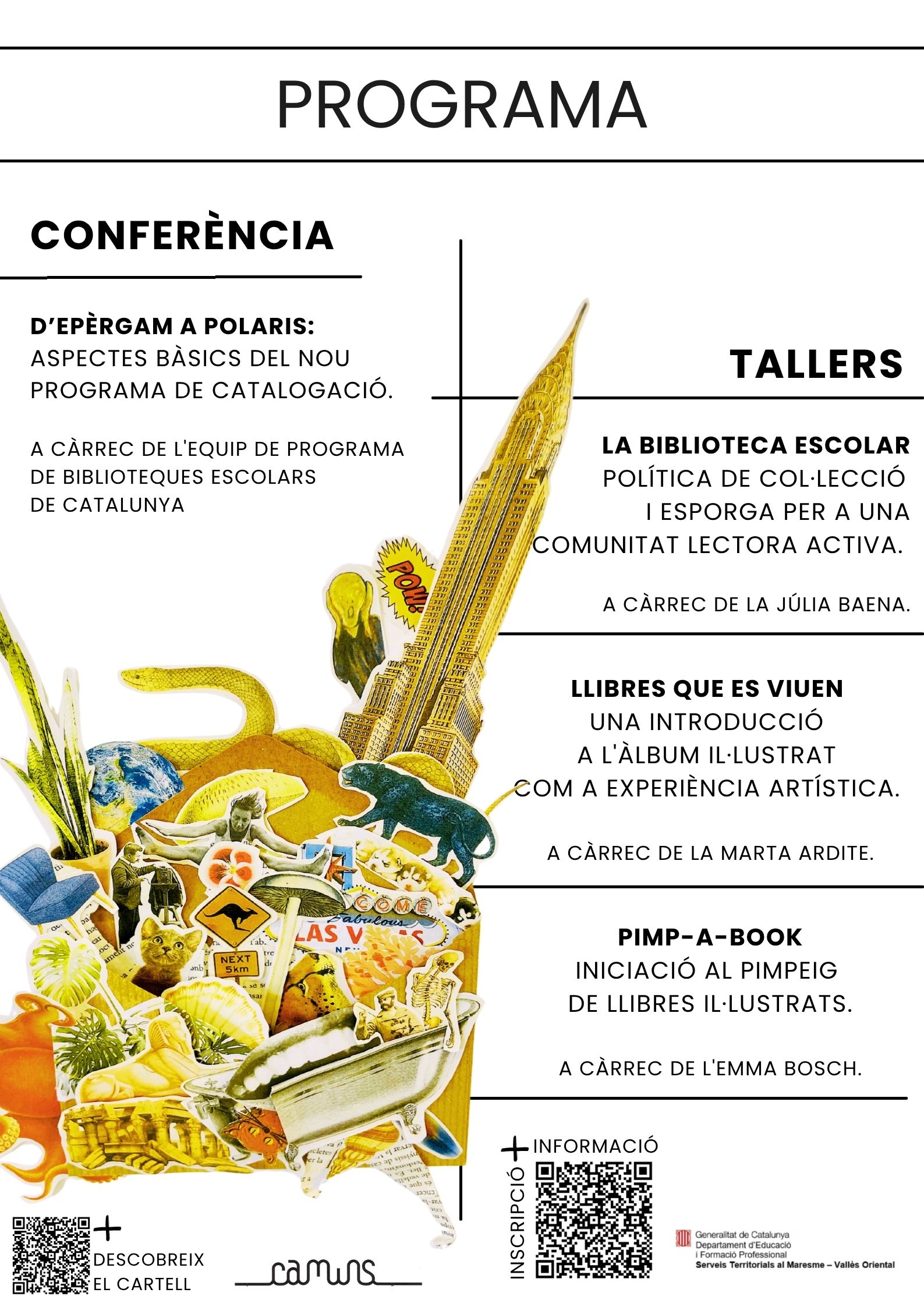 Una jornada per compartir i aprendre. Comptarem amb la conferència sobre el nou programa de catalogació Polaris i tallers com el de política de col·lecció i esporga amb la Júlia Baena, iniciació al pimpeig de llibres amb l’Emma Bosch i l’àlbum il·lustrat com a experiència artística amb la Marta Ardite.