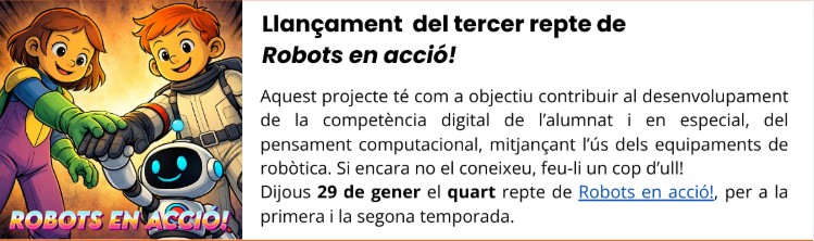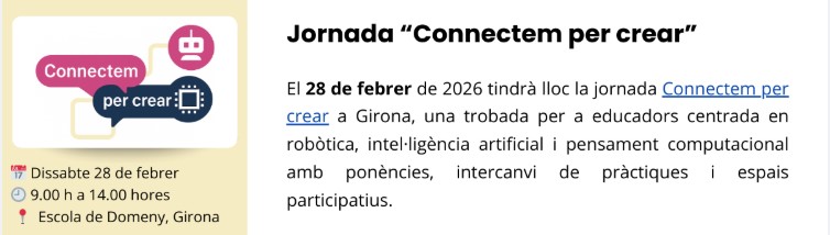 El dissabte 28 de febrer de 2026 se celebrarà a l’Escola de Domeny la jornada “Connectem per crear” dedicada a la divulgació de l’ensenyament de la robòtica, la intel·ligència artificial, el pensament computacional i la fabricació digital a l’aula. La jornada va dirigida a docents, professionals de l’educació i totes aquelles persones interessades en la integració de la dotació de robòtica a les aules.