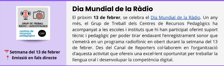El pròxim 13 de febrer, se celebra el Dia Mundial de la Ràdio, una data proclamada per la UNESCO per destacar la importància d’aquest mitjà de comunicació que, des de fa un segle, ens acompanya, informa i emociona. La ràdio ha estat testimoni de la història, un pont entre cultures i una eina essencial per a la llibertat d’expressió. Enguany la temàtica és el canvi climàtic i se celebra les nombroses oportunitats que ofereix la radiodifusió per donar VEU a l’emergència climàtica.