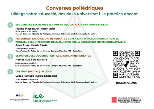 La primera proposta, creada conjuntament amb l’ICE de la Universitat Autònoma de Barcelona són unes Converses Polièdriques. Diàlegs sobre educació, des de la universitat i la pràctica docent.