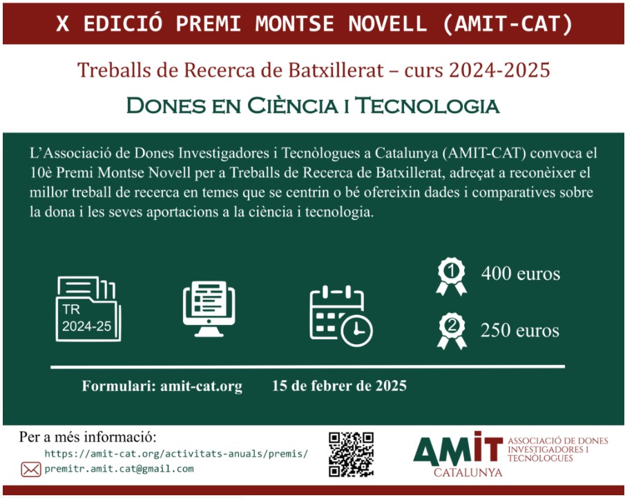 L’Associació de Dones Investigadores i Tecnòlogues a Catalunya (AMIT-CAT) convoca el X Premi AMIT-CAT per a Treballs de Recerca de Batxillerat, adreçat a reconèixer el millor treball de recerca sobre “dones, ciència i tecnologia”.